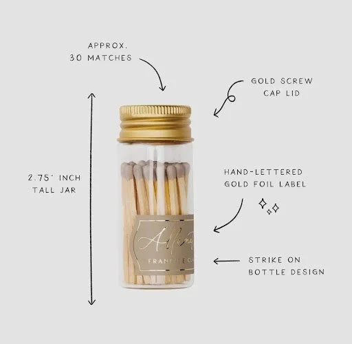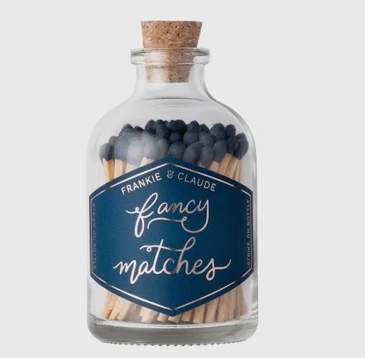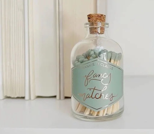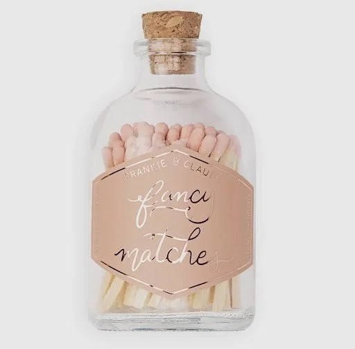 Adorn your mantle with our oh-so-pretty Fancy Matches™. Our custom colored matches are tucked into a corked glass apothecary jar. A match-striker is affixed to the bottom of the jar.